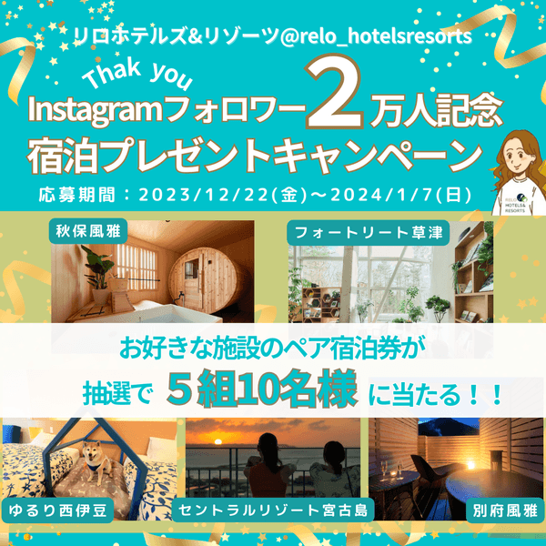 抽選で5組10名様に宿泊券が当たる!<2023年12月22日~2024年1月7日> リロホテルズ&リゾーツInstagramフォロワー数2万人突破記念キャンペーン開催