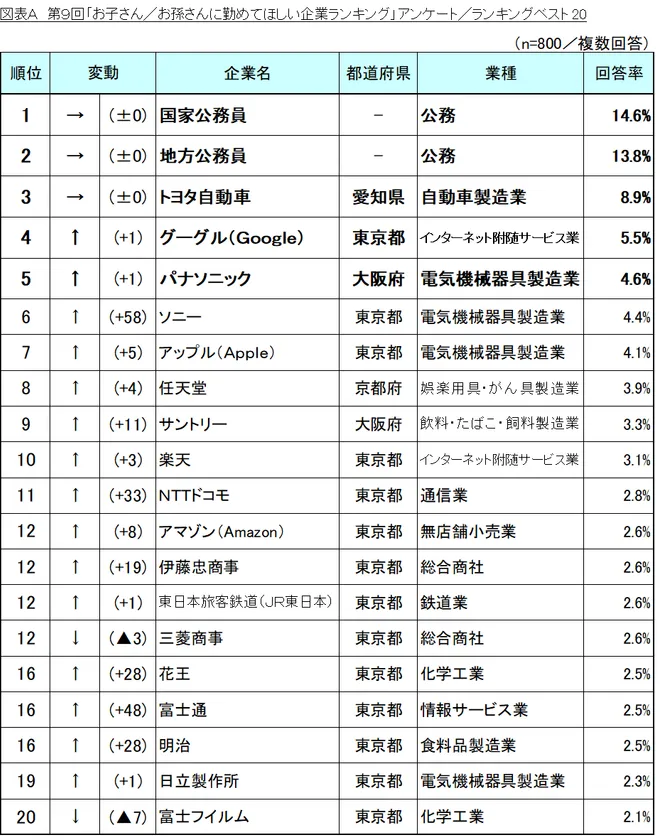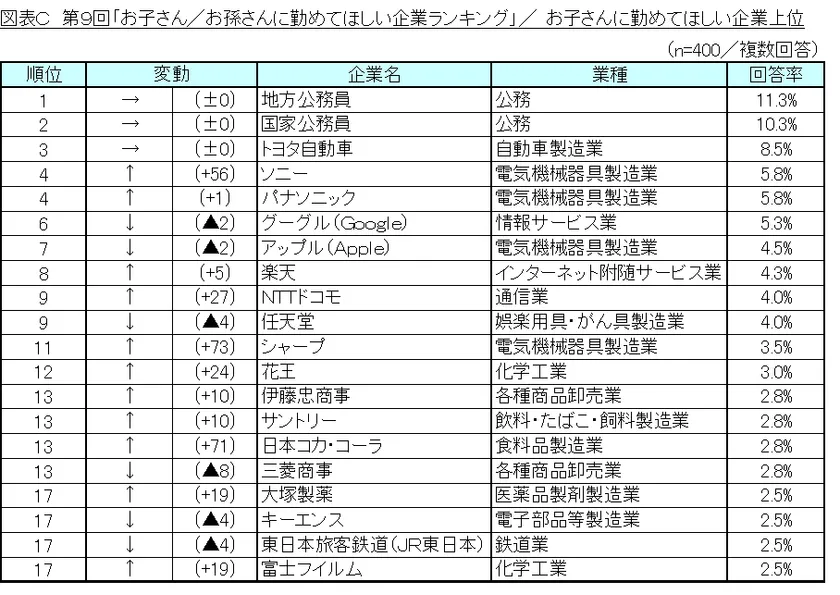 第8回「お子さん/お孫さんに勤めてほしい企業ランキング」の結果と比較したところ、トップ3の順位は変動なく、前回に続き1位「国家公務員」、2位「地方公務員」と公務員人気の根強さがみられました。また、3位の「トヨタ自動車」は、第1回調査から民間企業における1位を維持しており、民間企業の中では不動の地位を築いています。