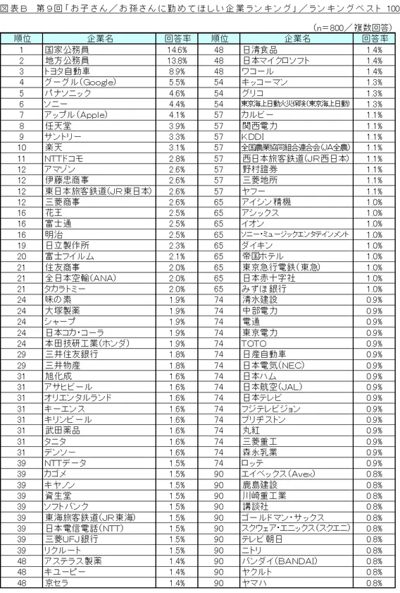図表B 第9回「お子さん/お孫さんに勤めてほしい企業ランキング」/ランキングベスト100