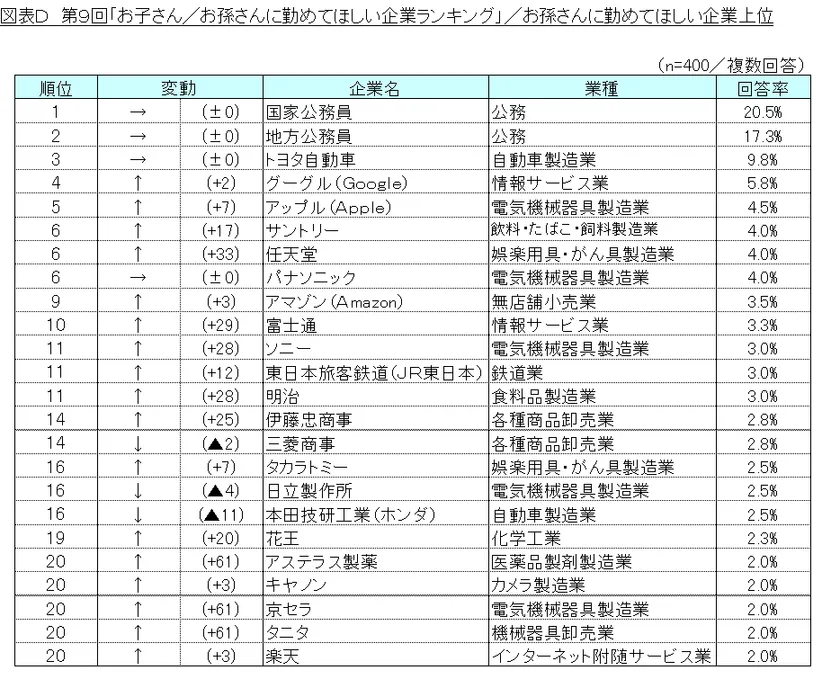 また、お孫さんに勤めてほしい企業ランキングは、1位「国家公務員」(回答率20.5%)、2位「地方公務員」(同17.3%)、3位「トヨタ自動車」(同9.8%)、4位「グーグル(Google)」(同5.8%)、5位「アップル(Apple)」(同4.5%)となりました。(図表D)