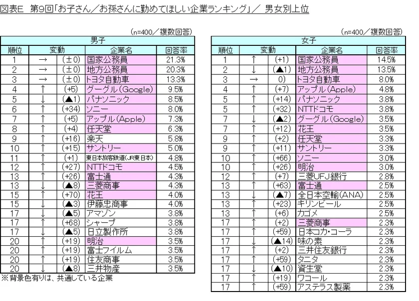 図表E 第9回「お子さん/お孫さんに勤めてほしい企業ランキング」/男女別上位