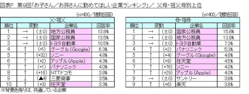 図表F 第9回「お子さん/お孫さんに勤めてほしい企業ランキング」/父母・祖父母別上位
