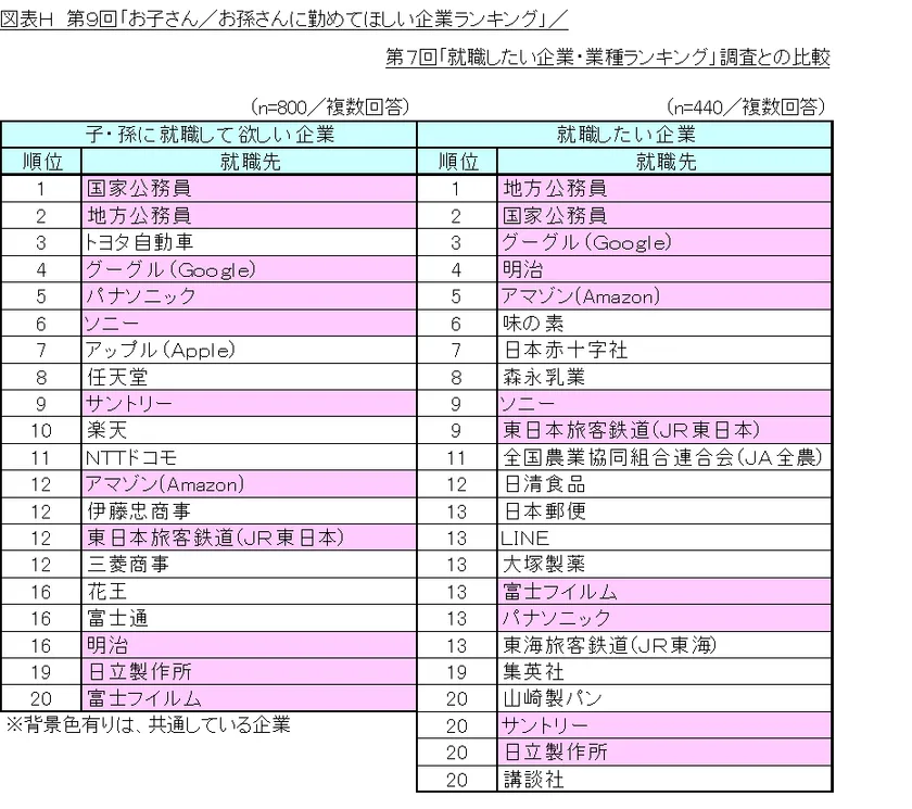 図表H 第9回「お子さん/お孫さんに勤めてほしい企業ランキング」/第7回「就職したい企業・業種ランキング」調査との比較