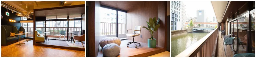 神田川に面した窓が大きく、開放感のあるコワーキングスペース。窓辺からの光と景色で気分転換ができ、ゆったりと仕事ができる空間に仕上げました。