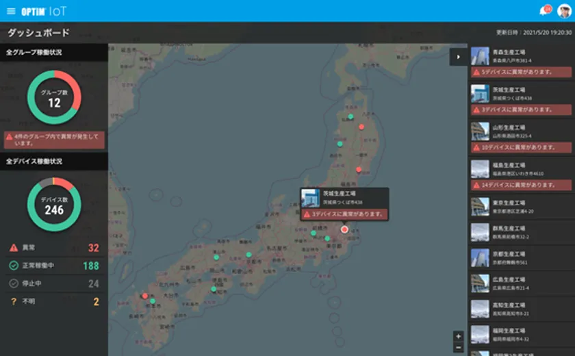 ・ さまざまな場所に設置した機器・装置の状況をクラウドから可視化、今どこの現場で何が起こっているかをリアルタイムに把握できます。