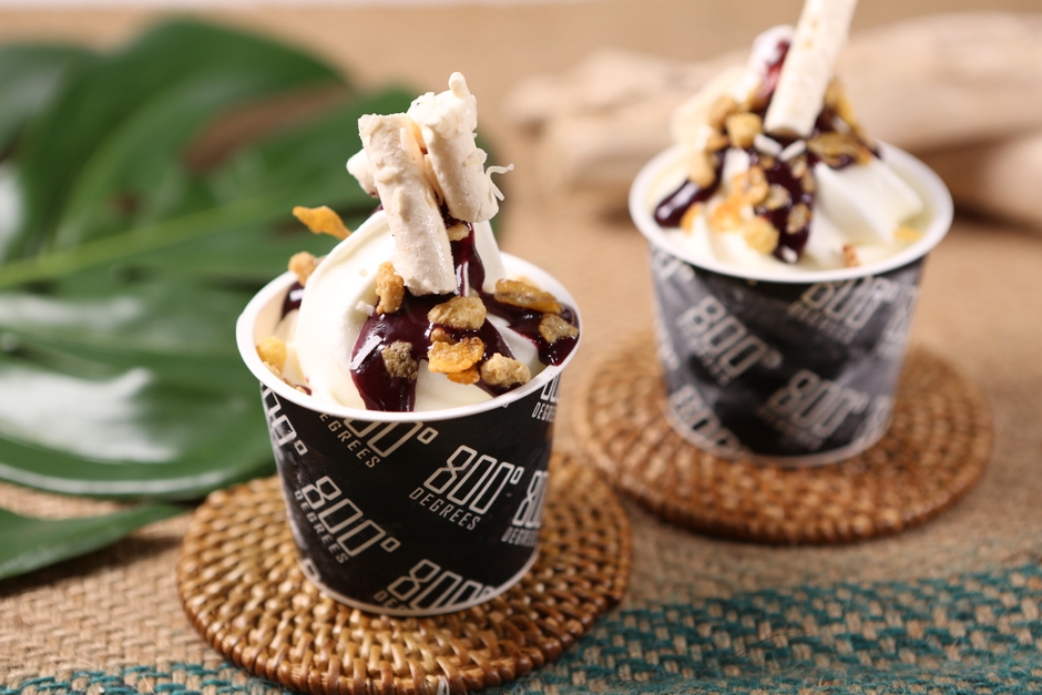 800°DEGREESオリジナルのフロマージュブランソフトクリームに、ハイビスカスティーとラズベリーをミックスしたアサイーソースをたっぷりとかけて仕上げました。夏らしくさっぱりとしたハワイを感じるソフトクリーム。