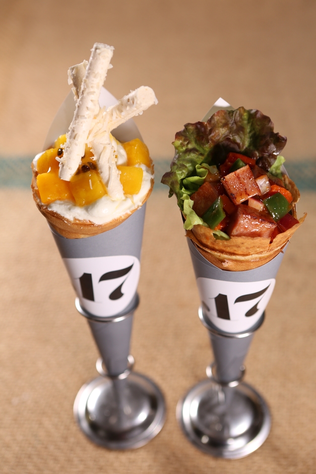 完熟マンゴーとリリコイ(パッションフルーツ)の酸味が夏の暑い季節にぴったりの爽やかさを感じさせるスイーツクレープ。ココナッツをまぶしたメレンゲクッキーが食感のアクセント。