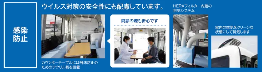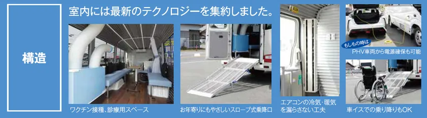 設置場所を問わずどのような場所にも移動訪問し、 ワクチン接種ができる機能を備えた医療用バスを開発。 保健所や病院が近くにない地域や、ワクチン接種会場への移動が困難な ご高齢の方などに向け、スムーズなワクチンや各種予防接種にご活用いただけます。
