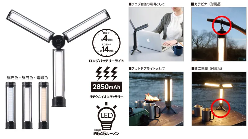 1台でアウトドアやweb会議、撮影用ライトや防災用懐中電灯など、様々な使い方が可能です。