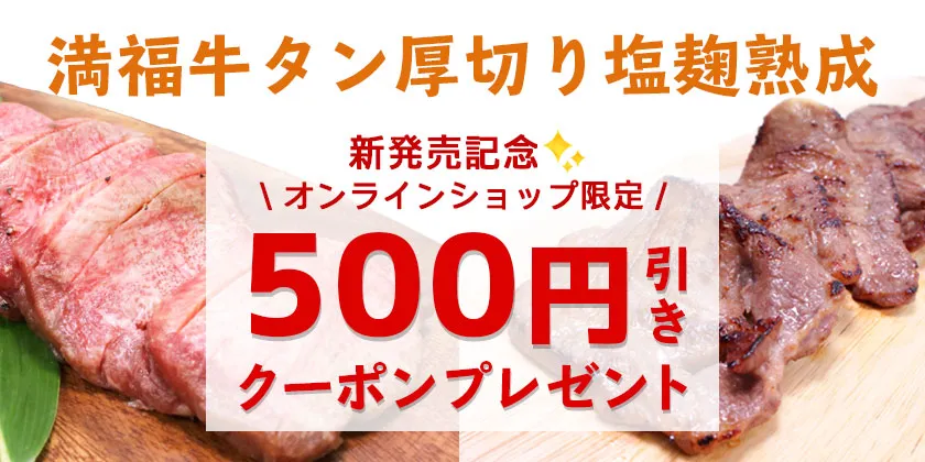 仙台で牛タン加工食品の製造・販売、牛タンレストランの運営を手がける株式会社陣中(本社所在地:宮城県仙台市、代表取締役:福山 良爾)は、新商品『満福牛タン厚切り塩麹熟成』の販売開始を記念して、陣中オンラインショップで使える「500円引きクーポン」をプレゼント中です。