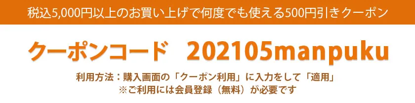 内容:税込5,000円以上のお買い上げで何度でも使える500円引きクーポン