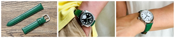 さらに今回は、全ての時計に交換用ベルトとして、レザーベルト(グリーン)をお付けいたします。ベルト単体で見ると少し冒険?と思ってしまうような、鮮やかな色のベルトをあえてチョイスしました。