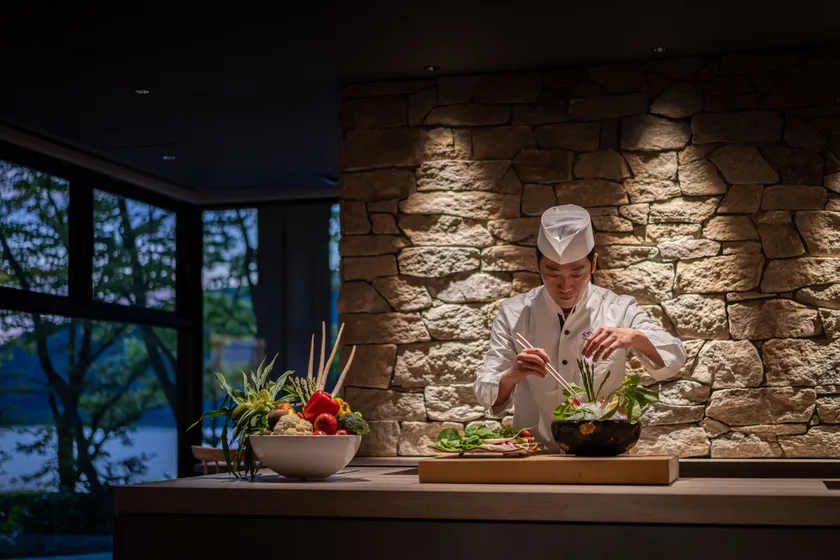 四季折々に表情を変えるおしどりの池を借景とした空間で有明海から揚がる新鮮な魚介類と雲仙で収穫される旬の野菜を豪快にかつ繊細に仕上げた懐石料理をお愉しみください。