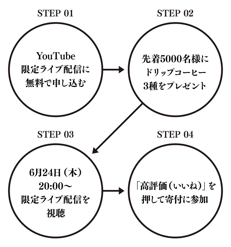 ※プロジェクトコーヒーチケット<ライブ配信+ドリップコーヒー3P>をお申し込みの方には、2021年6月中旬にドリップコーヒーを郵送にて発送いたします。ご了承ください。