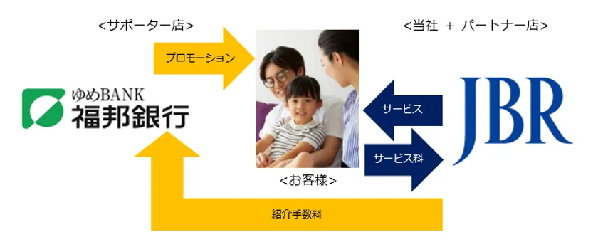 提携の開始に伴い、福邦銀行は当社のサポーター店として店頭でサービス内容や専用フリーダイヤルを告知するチラシを配布するなどの、プロモーション活動を実施します。サービス提供時にお客様から当社がいただくサービス料の一部を、サポーター店に紹介手数料としてお支払いします。また当社としてはWebやタウンページにかける広告宣伝費を必要としない、効率的な集客を実施できます。