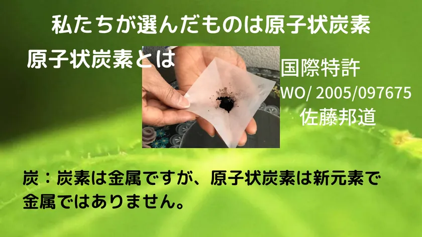 そんな時に出会ったのが株式会社EEN 代表取締役社長 佐藤 邦道氏の国際特許WO/2005/097675<原子状炭素>です。お水に混ぜて、上澄みを飲ませるだけというシンプルでお値段もお手頃。なのに内容の充実した逸品。