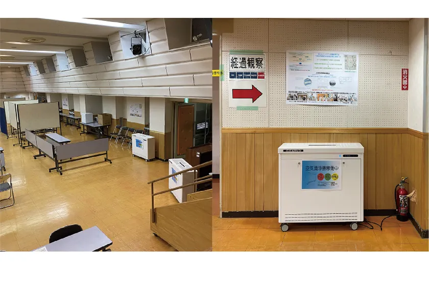 今回の接種会場においては、区民館のホールの容積は約1,411m3有り、既存の機械換気により1時間に2回の換気が行われております。「GRABVD」を7台設置する事により1時間に4回相当の換気回数を増やす事ができ、既存換気と合算すると1時間に6回の換気に相当します。これは「日本病院設備設計ガイドライン」で提唱されている集中治療室や救急外来の換気回数と同等となり、来場した方やスタッフの皆様に安心・安全な会場にてワクチン接種することができることになります。
