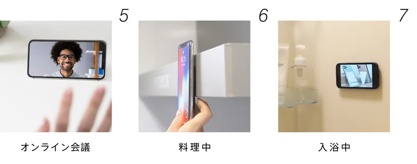 同梱のアタッチメントで、鏡・壁・ガラス・タイルなどなど、スマホを貼り付ける事ができます。