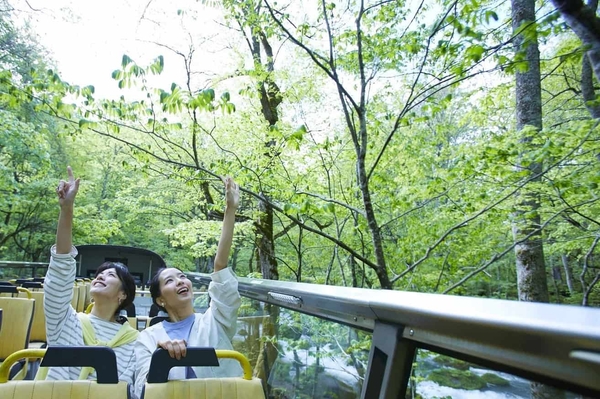 当ツアー最大の魅力は、圧倒的な開放感を味わえることです。オープンバスは屋根がないため、渓流のせせらぎや野鳥の鳴き声がよく聞こえ、森の香りも感じられます。また、運行するバスは渓流の景色や清々しい風、森の香りを存分に楽しんでいただけるようゆっくり走行するため、360度の絶景に囲まれて大自然を身近に感じることで、心身ともにリフレッシュできます。