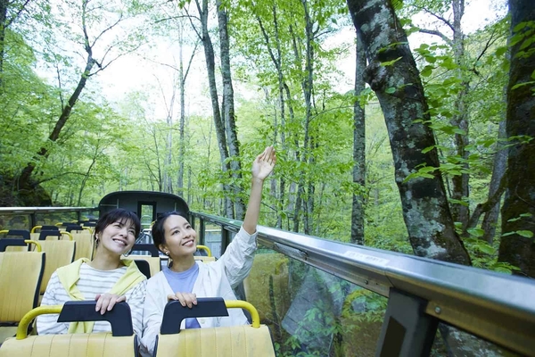 奥入瀬(おいらせ)渓流沿いに建つ唯一のリゾートホテル「星野リゾート 奥入瀬渓流ホテル」は、2022年5月20日~11月6日の期間、360度の絶景を楽しむ「渓流オープンバスツアー」を実施します。当ツアーは、2階建てのオープンバスで渓流沿いを走行するため、抜群の開放感を感じながら、360度見渡せる絶景を存分に楽しめます。奥入瀬渓流に初めて訪れる方はもちろん、一度は足を運んだことがある方も、新たな目線で奥入瀬渓流の自然を満喫できます。