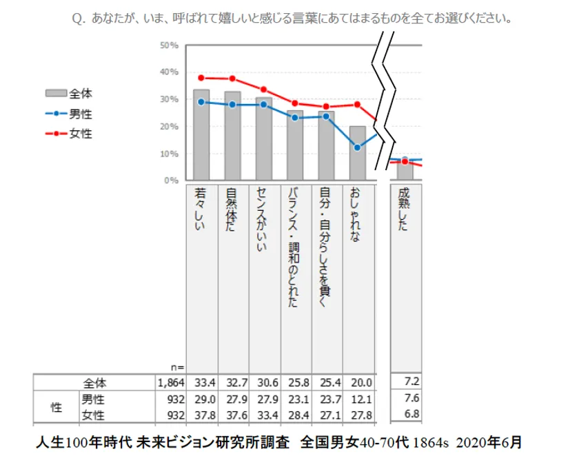 ■「新しい大人」のシンボルワード呼ばれて嬉しい言葉トップ3「若々しい」「自然体」「センスがいい」は全て女性が高い。「呼ばれてうれしい言葉」の上位6位まで、全て女性のほうが高くなっています。とりわけトップ3の「若々しい」「自然体だ」「センスがいい」はいずれも女性が高いといえます。