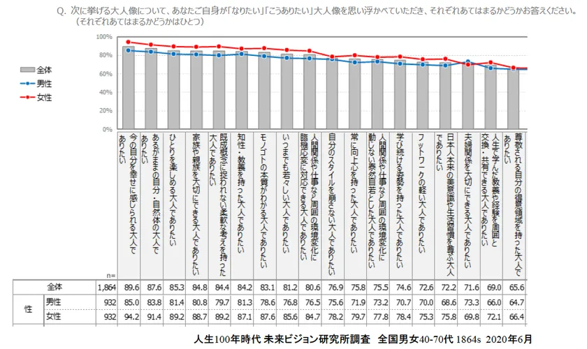5位「既成概念に捉われない柔軟な考えを持った大人でありたい」、8位「いつまでも若々しい大人でありたい」など1位から18位まで89.6%~65.6%と高い水準ですが、いずれも女性のほうが上回っています。唯一「夫婦関係を大切にできる大人でありたい」のみ、男性が上回っています。