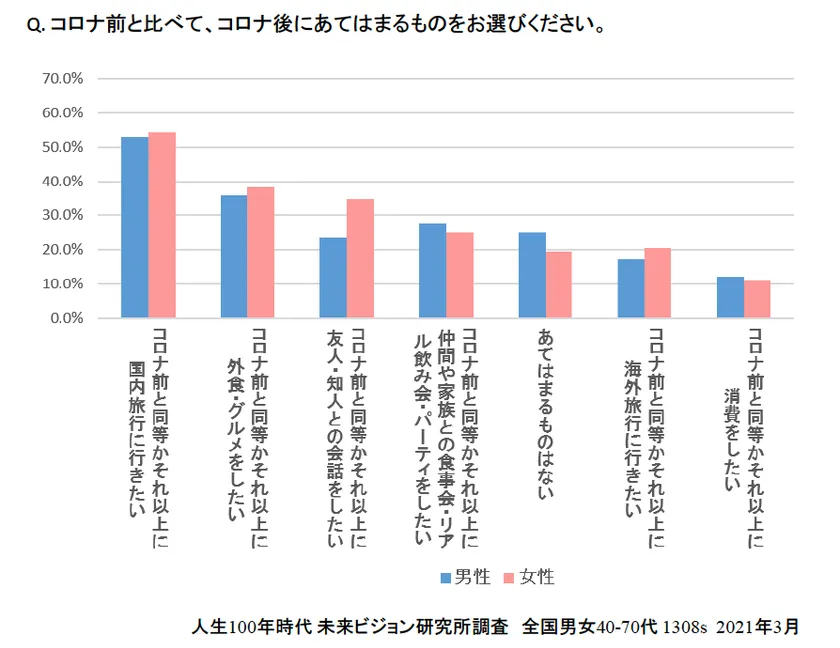 「コロナ前と同等かそれ以上にやりたいこと」のトップ3は「国内旅行」「グルメ」「友人・知人との会話」であり、
