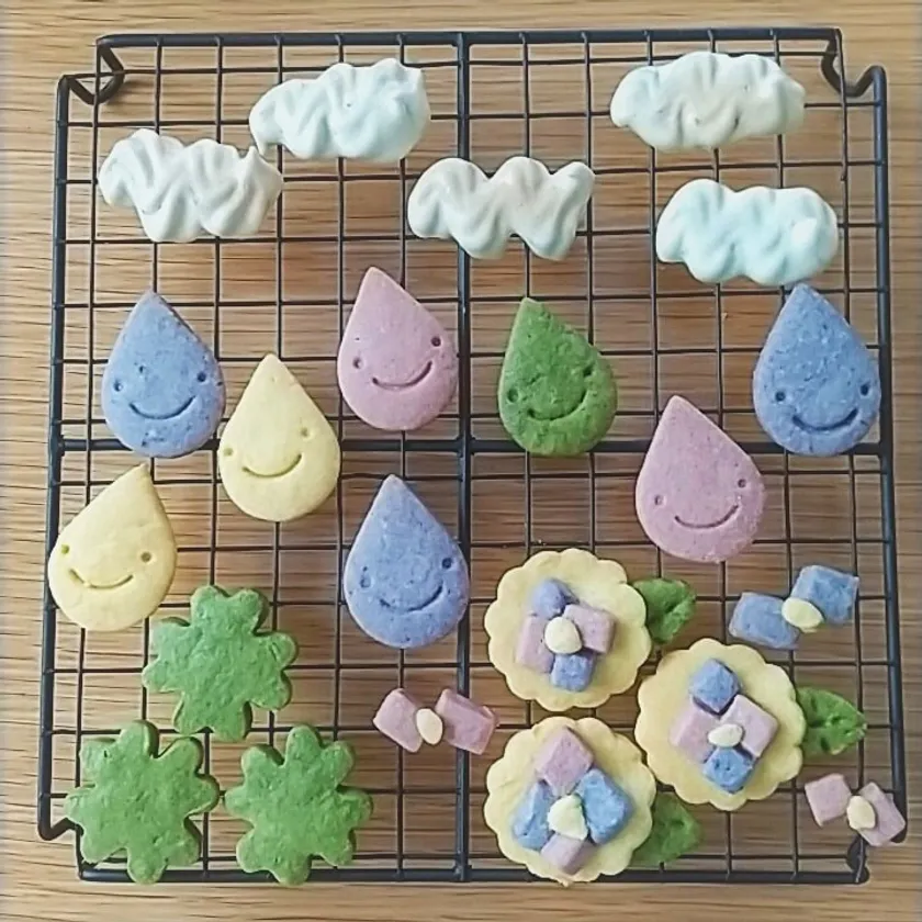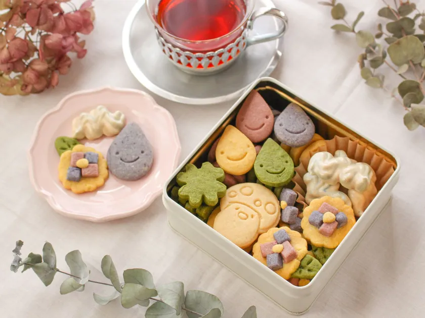 6月のクッキー缶は、梅雨の季節を意識した水玉・四つ葉のクローバー・紫陽花・メレンゲの雲(着色料不使用、抹茶、野菜、花のパウダー)。