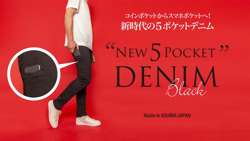 スマホ用ポケットがついたデニムとして話題を集める 「NEW 5 ポケットデニム」がニューカラー「ブラックデニム」を 発表!5月24日より応援購入サービスMakuakeにて先行販売開始。