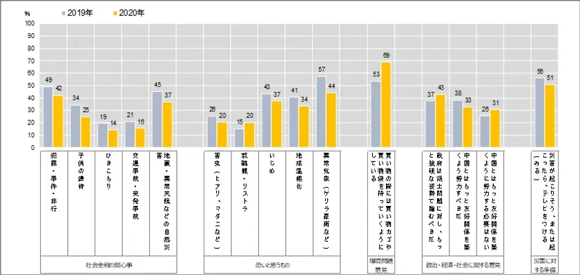 ・社会意識等の項目では、<コロナ禍以外の災害や社会問題への関心の低下><就職難・リストラの恐れの増加><中国に対する反感の増加>傾向があげられる。