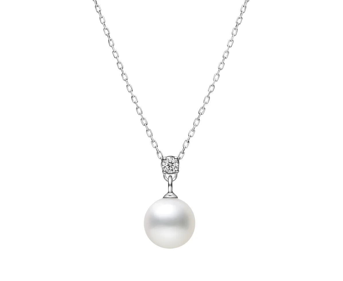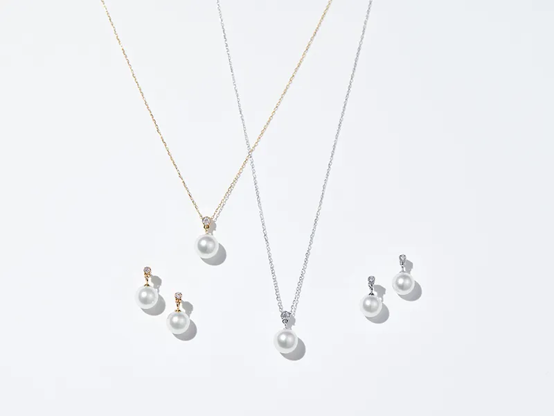 天然の白色と美しい丸みを帯びたパールに、メレダイヤモンドの煌めきがやさしく降り注ぐデザイン。やわらかな月の光を思わせる ほんのりと上品な輝きが、大切な記念日の想いにやさしく寄り添います。洗練されたシンプルな装いで 幅広いシーンで活躍するネックレスです。