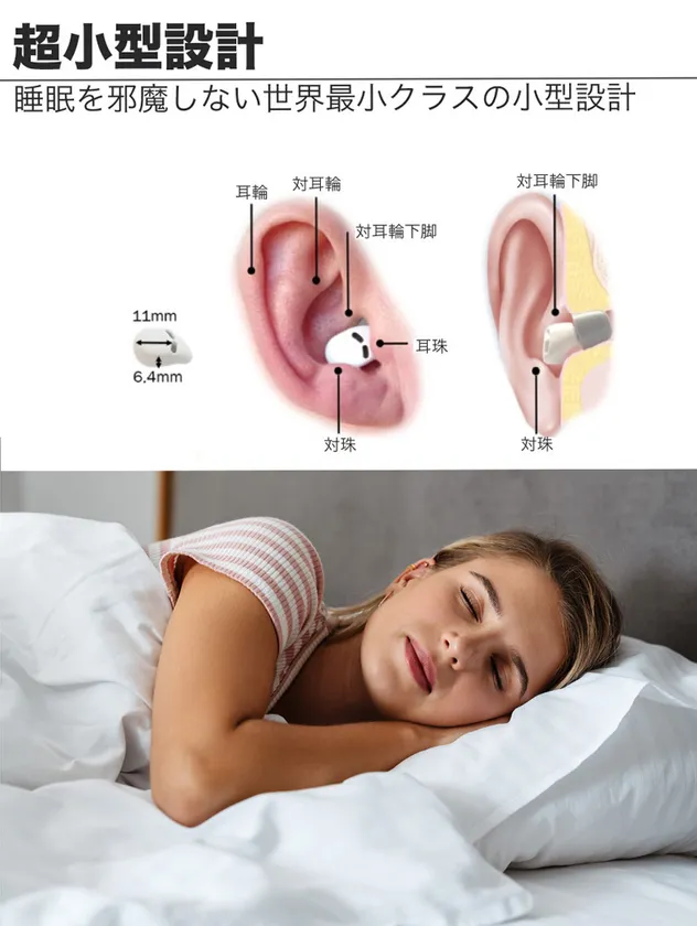 一般的な大人の耳サイズの場合、QuietOn3は通常、対耳輪下脚と対珠の間にある耳甲介の内側に収まります。この位置とQuietOn3の小ささで、横向きに寝る人でもイヤープラグが枕に触れる事なく、耳に圧迫感を感じさせない為、装着を気にせず眠りにつく事が出来ます。