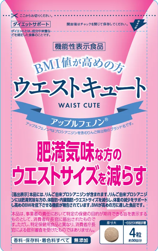 桜華株式会社が発売する「ウエストキュート」は、「BMI値が気になる方」に向け、「内臓脂肪の低下」「ウエストサイズの低下」「体重の減少」「BMI値の低下」などの機能が報告されているアップルフェノン(R)を関与成分とした機能性表示食品サプリメントで、2020年11月に消費者庁により「機能性表示食品」としての承認を受け、販売サイトの準備を行ってきました。