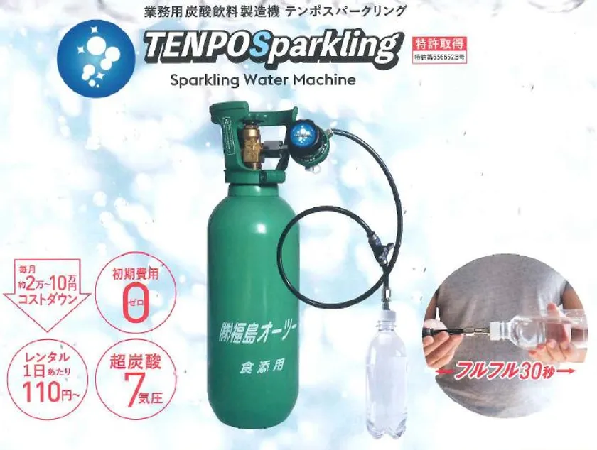 しかし、この「テンポスパークリング」で製造すると500mlのペットボトル1本あたりのガス代は約5円となり、市販が約80円となりますので、原価を抑えるメリットがあります。また、製造機は販売ではなく初期費用無料のメンテナンス付きレンタルとなりますので、導入メリットも高くなっております。