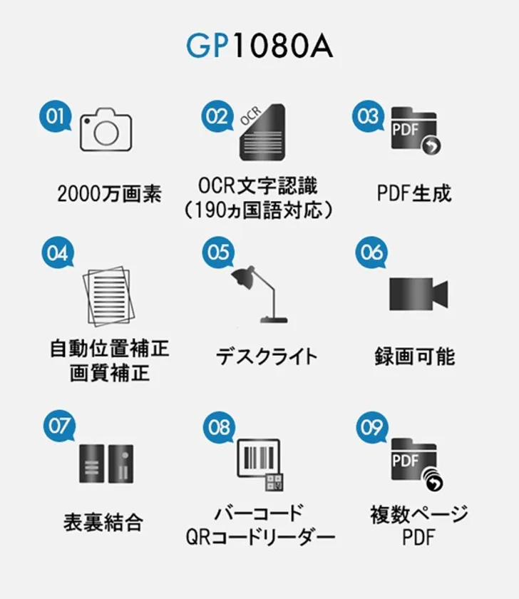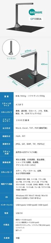 「GP1080A ポータブルスキャナー」は2000万画素の高解像度でスキャン&データ化が可能。家庭やオフィスでもスペースを必要としません!