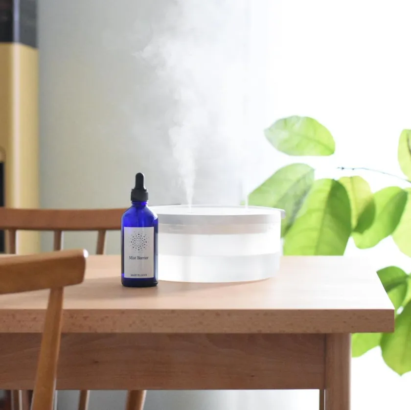 Mist Barrierは、「高い安全性」「広い除菌範囲」「コンパクト」が特徴の、加湿器に入れて使う空間除菌剤です。