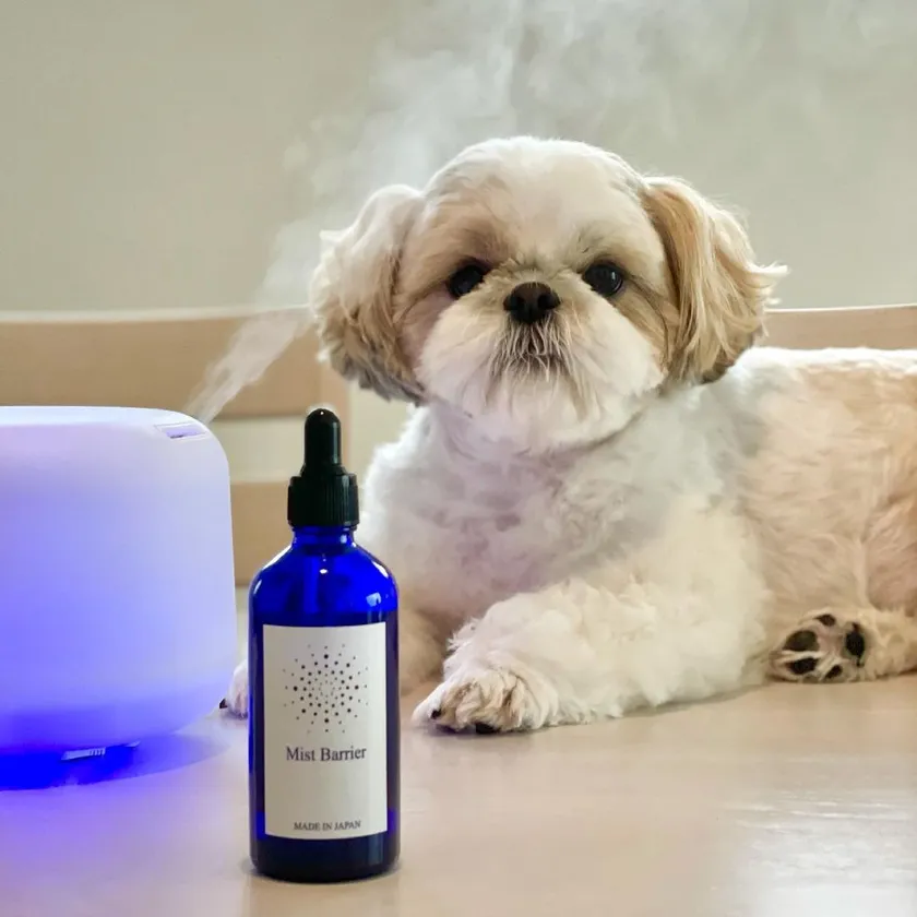 “加湿器に入れて使う空間除菌剤使ってます。Mist Barrierはナチュラル成分100%の『フルボ酸』から出来ているから、赤ちゃんが飲んでも安全なんだって!だからペットにも安心して使える!”