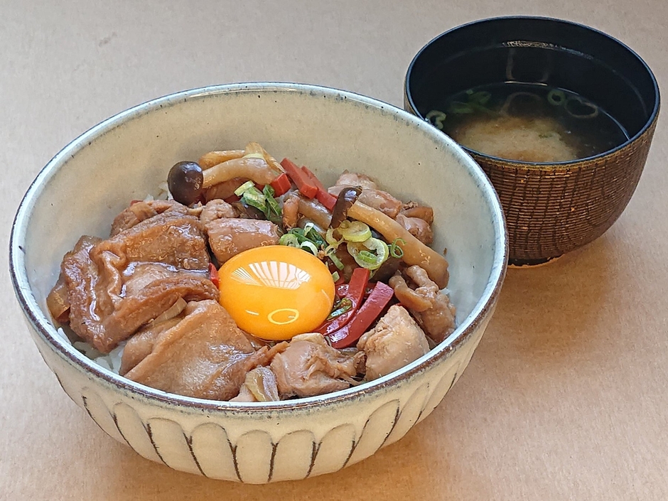 滋賀県北部の伝統鍋料理「じゅんじゅん」をアレンジし、旅の途中で気楽に食べていただける鶏の丼に仕上げました。赤こんにゃく、丁字(ちょうじ)麩(ふ)などの滋賀県の食材を取り入れ、器には「信楽焼」を使ったこだわりの逸品。