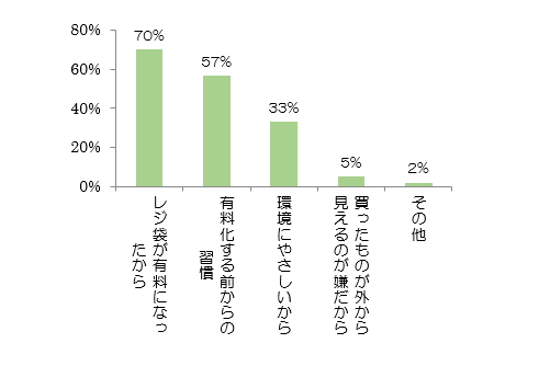 エコバッグを持っていく理由として1番多かったのは「レジ袋が有料になったから」。次いで「有料化する前からの習慣」という回答も57%と、半数以上は有料化前からの習慣であることも分かりました。