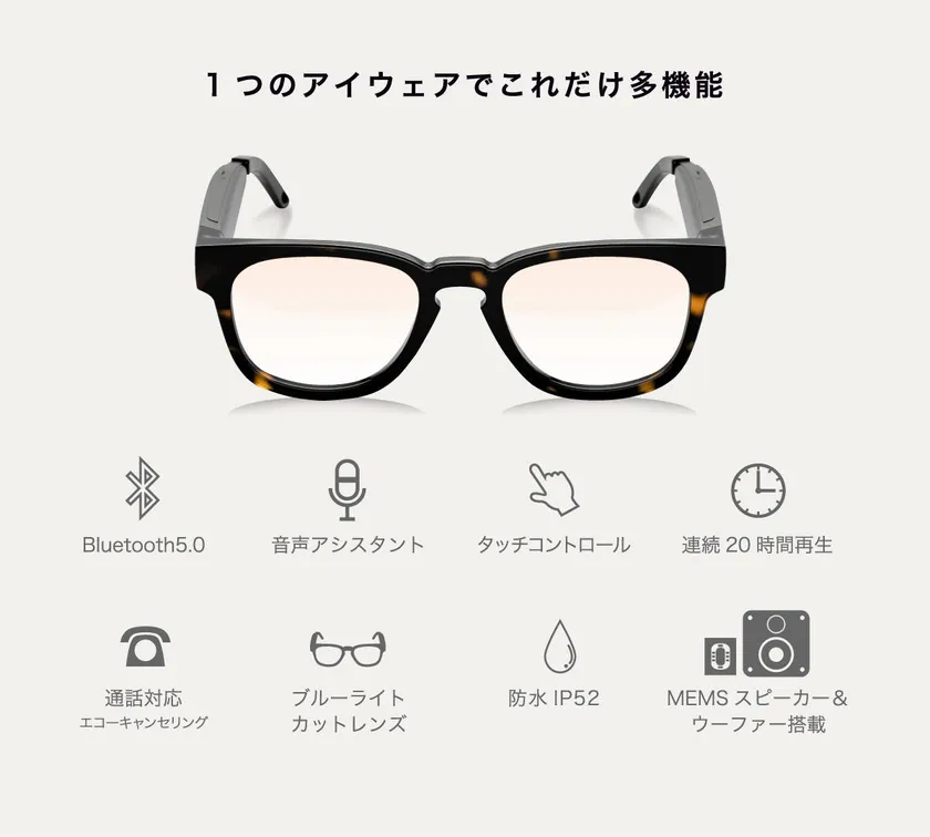 従来のオーディオグラスには無かった、フレームとレンズにもこだわりを持ったハイブランドにも引けを取らない高品質な素材を採用。