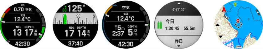 左からメインダイブ画面、水中3軸電子コンパス、セーフティモード、潜水データ記録、フルカラーマップ