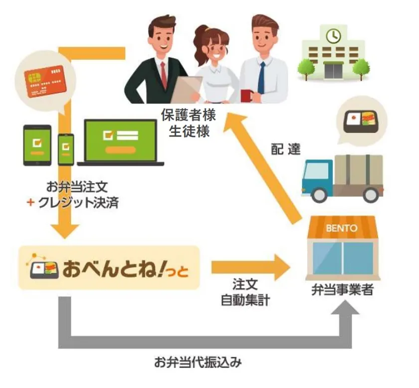 お弁当を希望する保護者または生徒本人がスマートフォンまたはパソコンからお弁当を直接注文・決済。お弁当が学校や児童クラブなどの学童保育に届けられます。お弁当の個数の取りまとめや現金回収など、これまで保護者会で受け持ってきた調整がすべて不要になる、共働き世帯をサポートするサービスです。