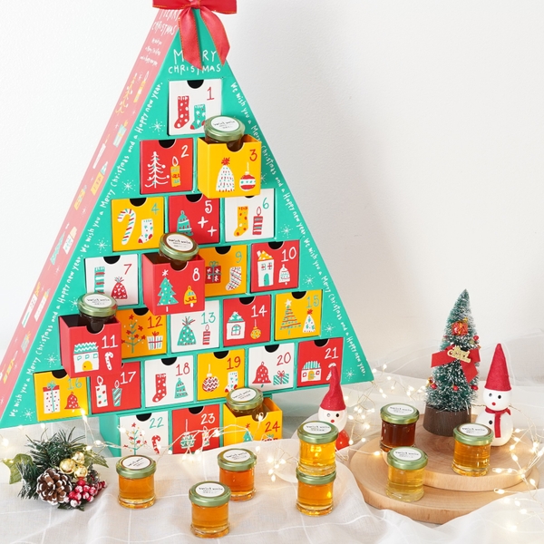 内容:クリスマスツリー型のアドベントカレンダーの引き出し全てに、可愛らしい30g蜂蜜を詰めました。クリスマスまで毎日引き出しをあけて、何がでてくるかワクワク。美味しく楽しくカウントダウンしましょう!