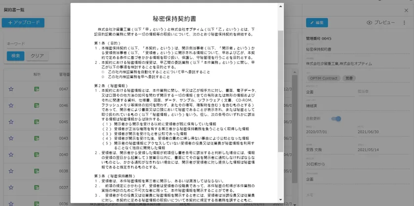 このような課題を解決すべく、AIが契約書情報の記入を代行し、目的の契約書に検索機能ですぐにアクセスできる機能や、契約更新期日の自動通知機能など、契約書管理業務を効率化し、管理コストや不履行リスクを削減する、「OPTiM Contract」を発表することといたしました。