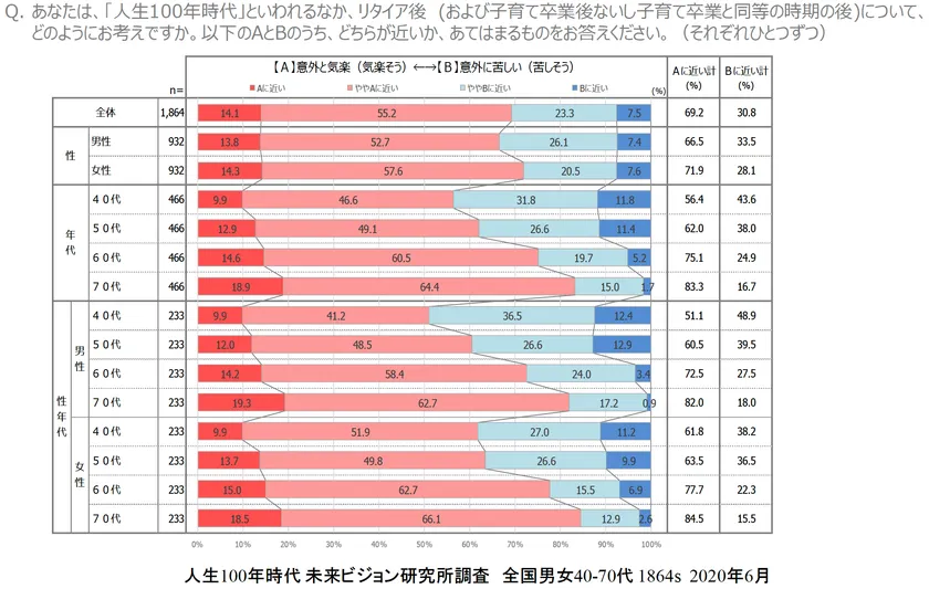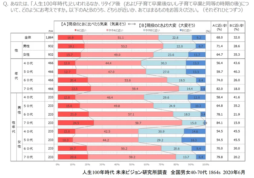 ■「定年(リタイア)後は意外と気楽」が68.2%、60代75.1%、70代83.3%と年代が上がる程圧倒的に「気楽」。