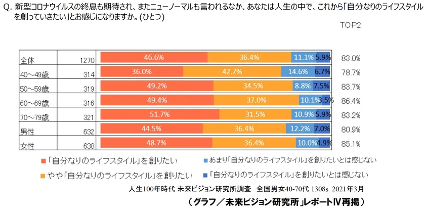 ポストコロナ、ニューノーマルのなかで、「自分なりのライフスタイルを創りたい」は平均で83.0%ですが、トップは定年(リタイア世代)である60代の86.4%であり、70代も83.2%と平均よりわずかだが高いといえます。70代といえば一般的には健康寿命の世代ですが、「これから創りたい」が8割を超えています。
