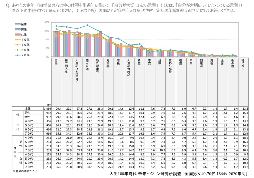 ■定年で大切にしたい言葉、1位は「自由」、トップ10のうち「新たな出発」「充実感」「希望」と4ワードが前向き。