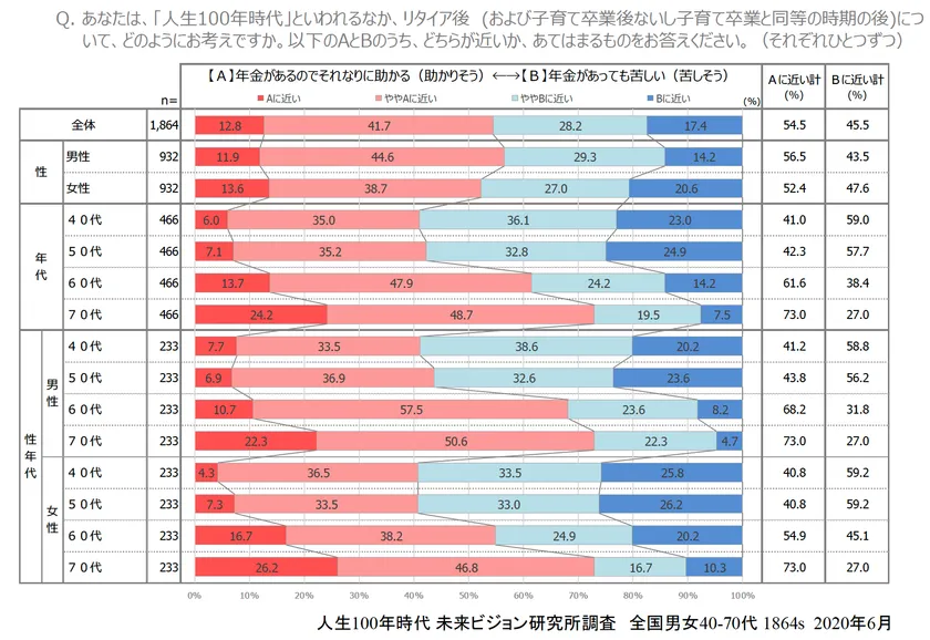 「年金で助かる」か「年金があっても苦しい(苦しそう)」か、については、「助かる」について60代61.6%、70代73.0%と年代が上がる程高くなります。「年金があっても苦しそう」は40代59.0%、50代57.7%と現役世代は5割強がそう答えています。現役世代は現在のスーツ着用や日々都心飲食の生活のようにおカネがかかると思うと年金だけではとても苦しそうだ、と思いがちですが、定年(リタイア)すると、現役時のようにはおカネのかかるわけでもない日常になるために、年金があると「助かる」という気持ちが強くなるといえます。