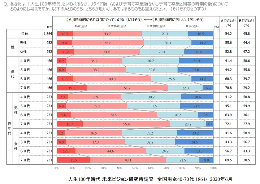 「経済的にやっていける(いけそう)」か「経済的に苦しい(苦しそう)」か、については「やっていける」について60代60.3%、70代70.8%、「経済的に苦しそう」は40代58.6%、50代55.8%であり、年金同様、定年(リタイア)世代は「それなりにやっていける」と思っていますが、現役世代は、「苦しいに違いない」という思い込みがあるとみられます。