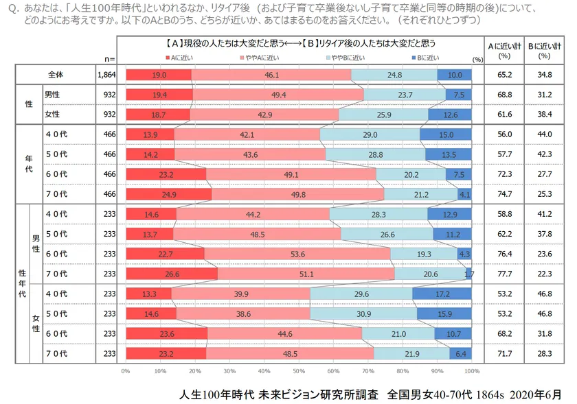 実際の定年(リタイア)世代は「現役は大変」で「いまは気楽」。現役世代は「定年(リタイア)後は苦しいはず、大変なはず」。
